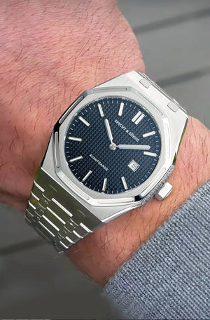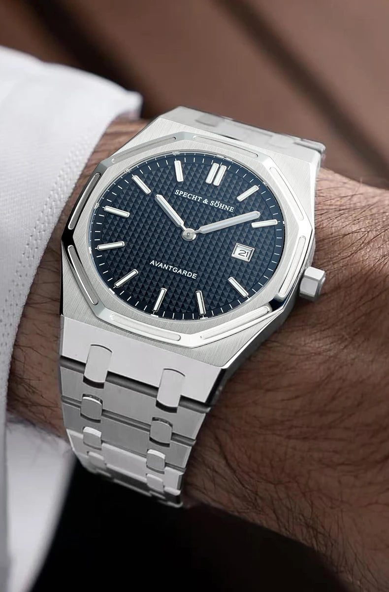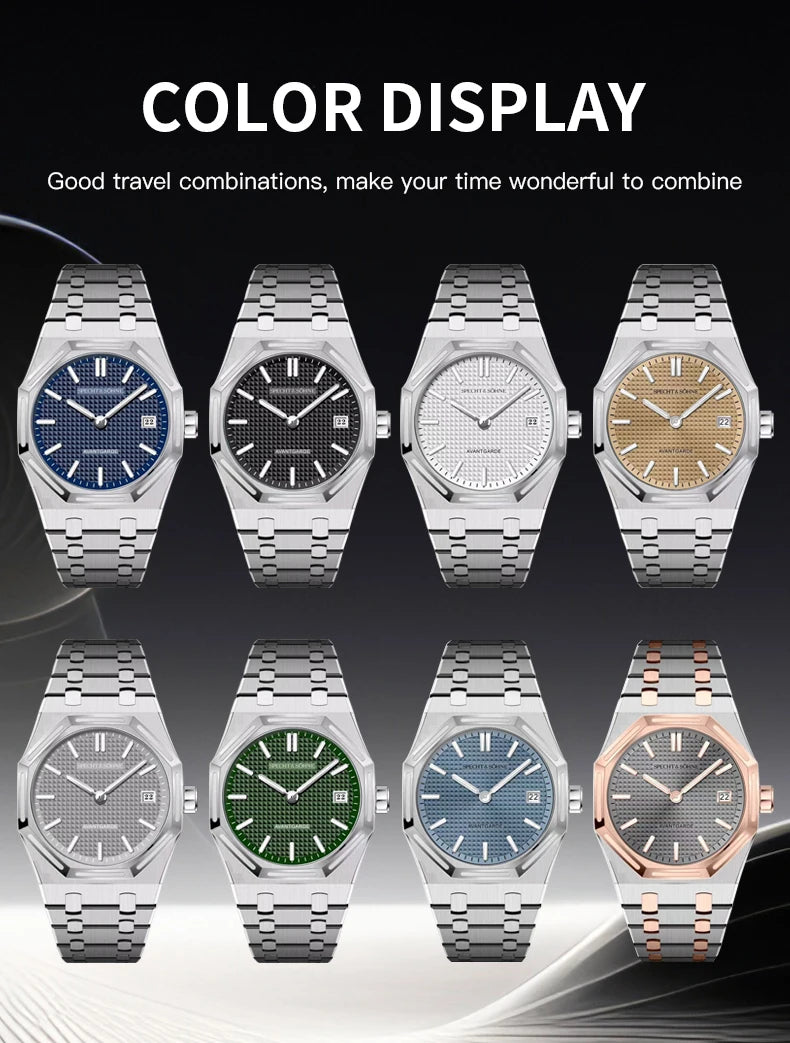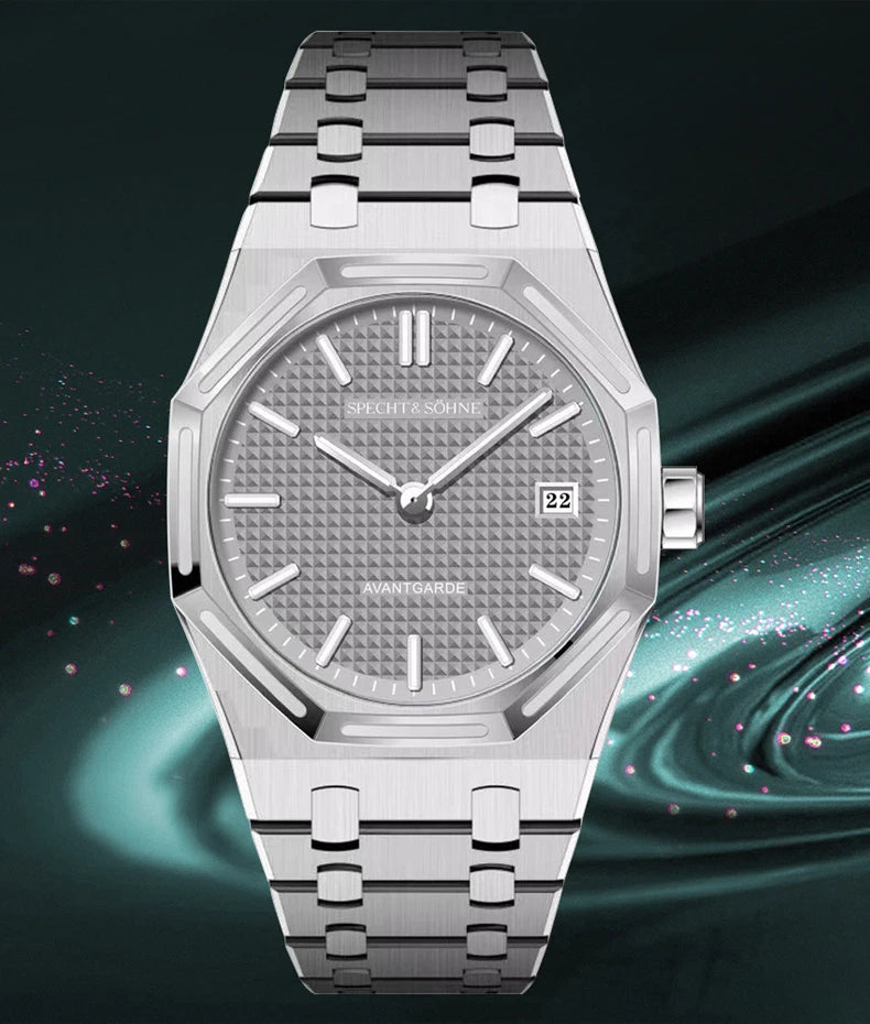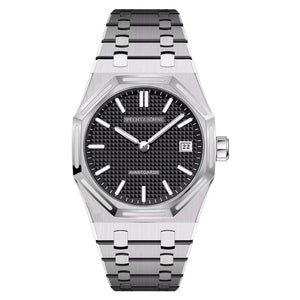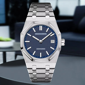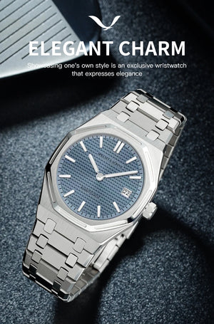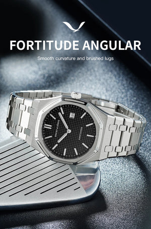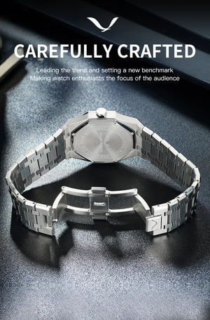 Luxury sports quartz watch inspired by the iconic PRC 100 octagonal design. Powered by a reliable Japan VX3K quartz movement, this ultra-thin 316L stainless steel watch features a sharp octagon case, sapphire crystal, and luminous dial and hands. With a sleek 8.3mm case thickness and comfortable integrated steel bracelet, it delivers refined elegance for everyday wear. Rated 50M water resistance, suitable for daily use and light water exposure.