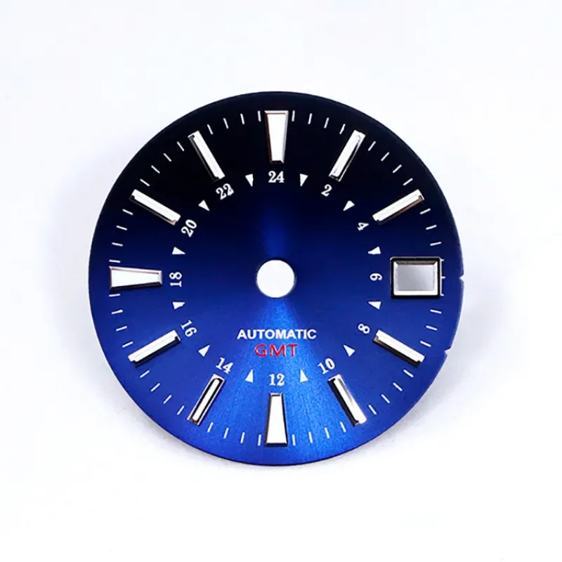 A premium 28.5mm sunburst dial designed for high-end modifications. Featuring a vibrant sunburst finish, silver indices, and blue BGW9 lume, it elevates any build. Its key advantage is dual compatibility: it works with standard NH35/36 and GMT NH34 movements. With the option for a custom logo and a free movement upgrade service, it offers exceptional value and flexibility for modders and micro-brands.