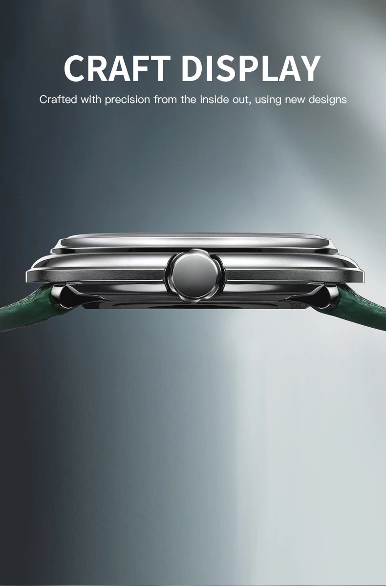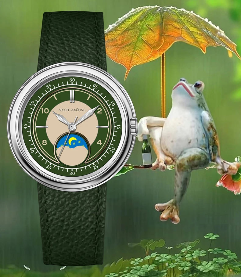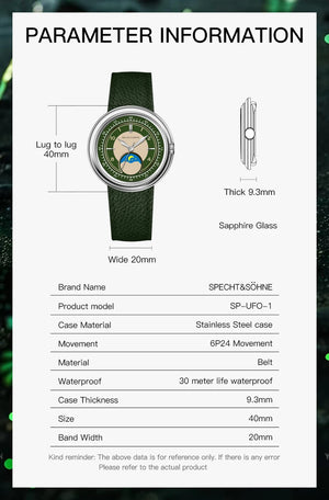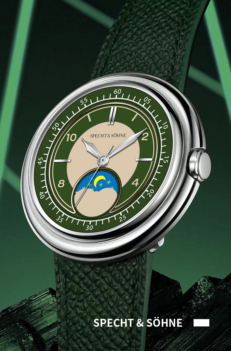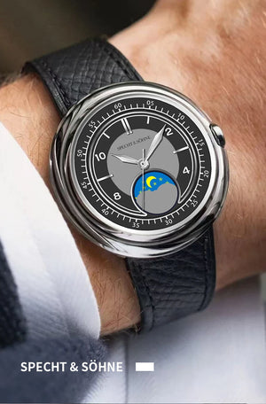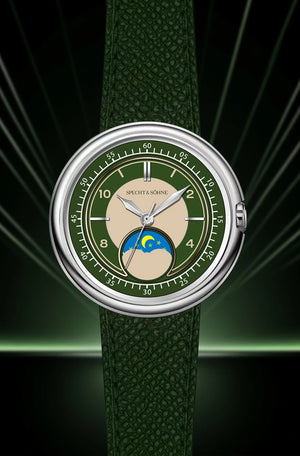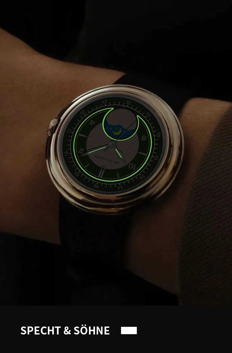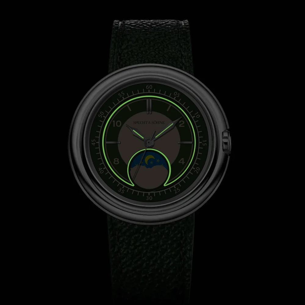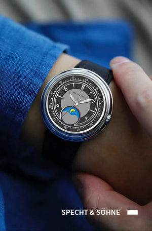 he Quartz Moon Phase Watch Specht & Söhne SPUFO1 combines precision quartz movement with sophisticated pilot watch aesthetics. This 40mm timepiece features a luminous dial for enhanced visibility in low-light conditions and a moon phase complication that tracks lunar cycles with accuracy. The sapphire crystal resists scratches while maintaining optical clarity, while 50m water resistance suits daily wear and light water exposure. A refined choice for those who appreciate functional design and reliable timekeeping.