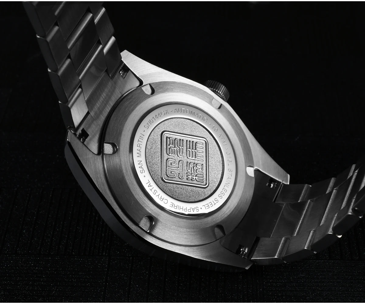Screw-down Case Back, Engraved with Chinese stamp "Made in San Martin", inspired by the stamp on the bottom of Chinese porcelain "JianZhan".