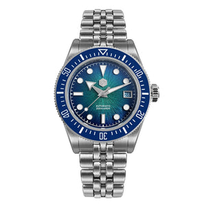 The San Martin Diver SN0148G features a precise Miyota 9015 automatic movement housed in a robust 40mm case. Its enamel sunburst dial offers exceptional legibility and elegance, complemented by anti-reflective sapphire crystal for durability and clarity. Rated to 20 bar, this watch is built for serious underwater use, while the BGW9 lume ensures excellent visibility in low-light conditions. A refined choice for enthusiasts seeking reliability and sophisticated design in a professional-grade diver.