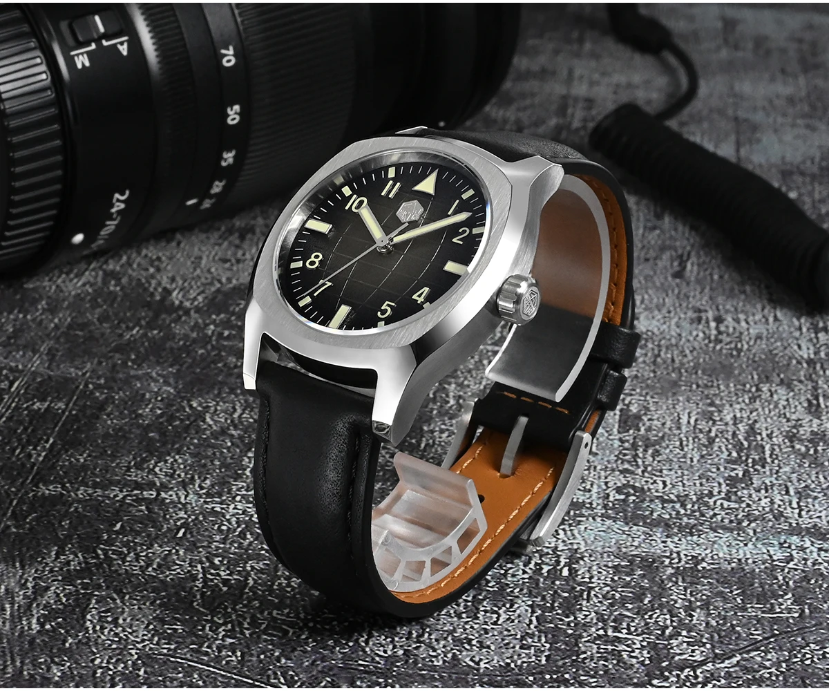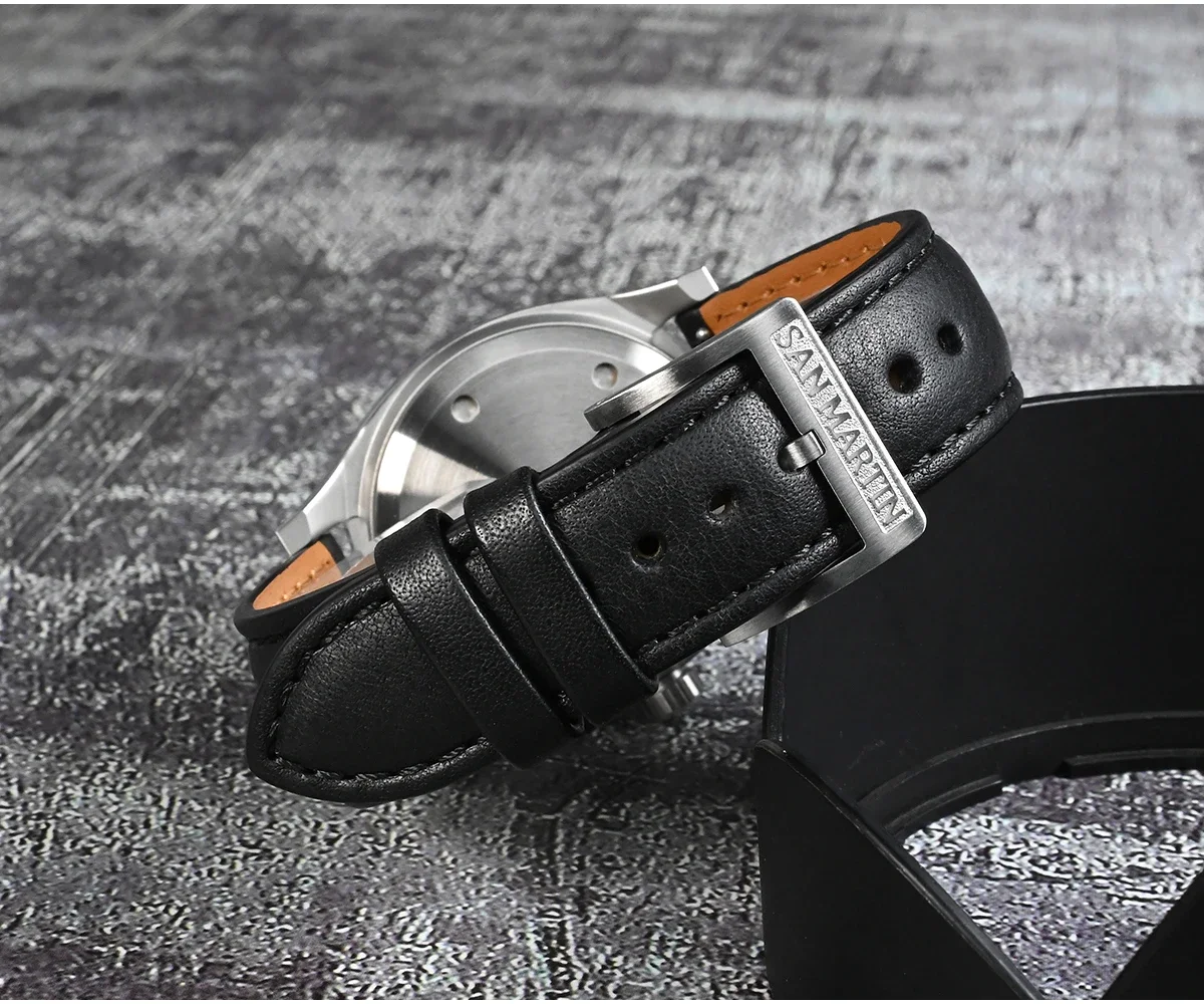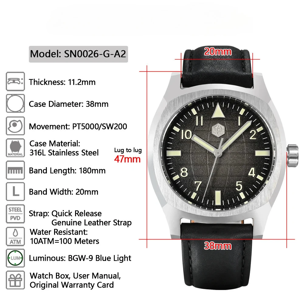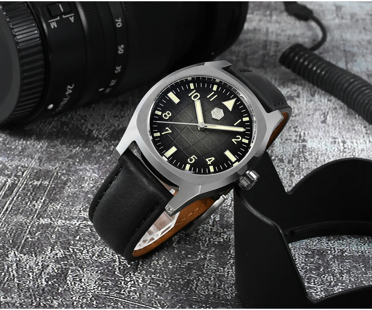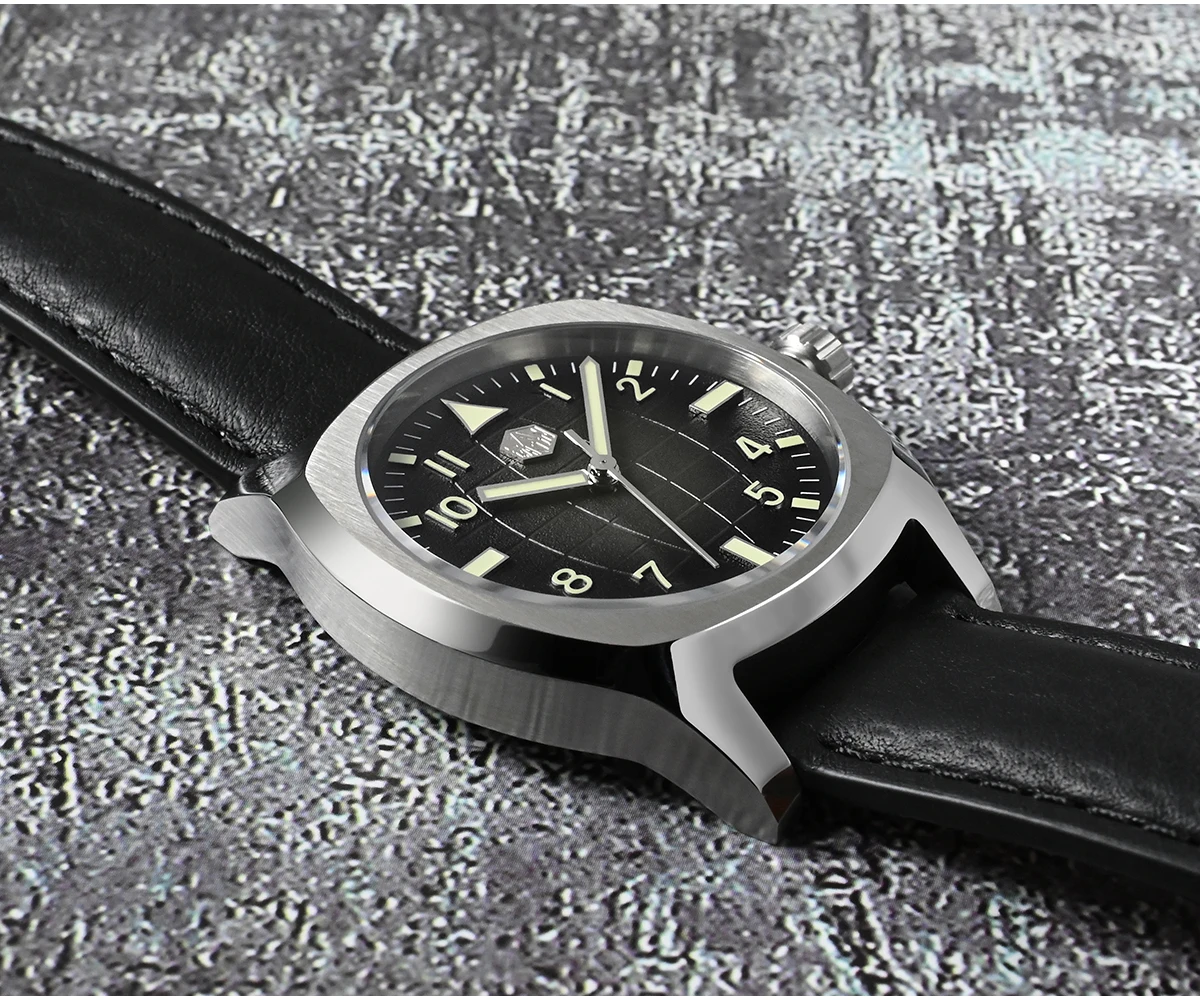 The San Martin Dress Watch SN0026 features a 38mm case with a distinctive grid-textured dial powered by a reliable PT5000 SW200 automatic movement. Its sapphire crystal ensures durability, while the 10 BAR water resistance provides practical protection. Enhanced with C3 lume, this timepiece offers excellent legibility in low light. Designed for discerning enthusiasts, it blends original aesthetics with robust performance.