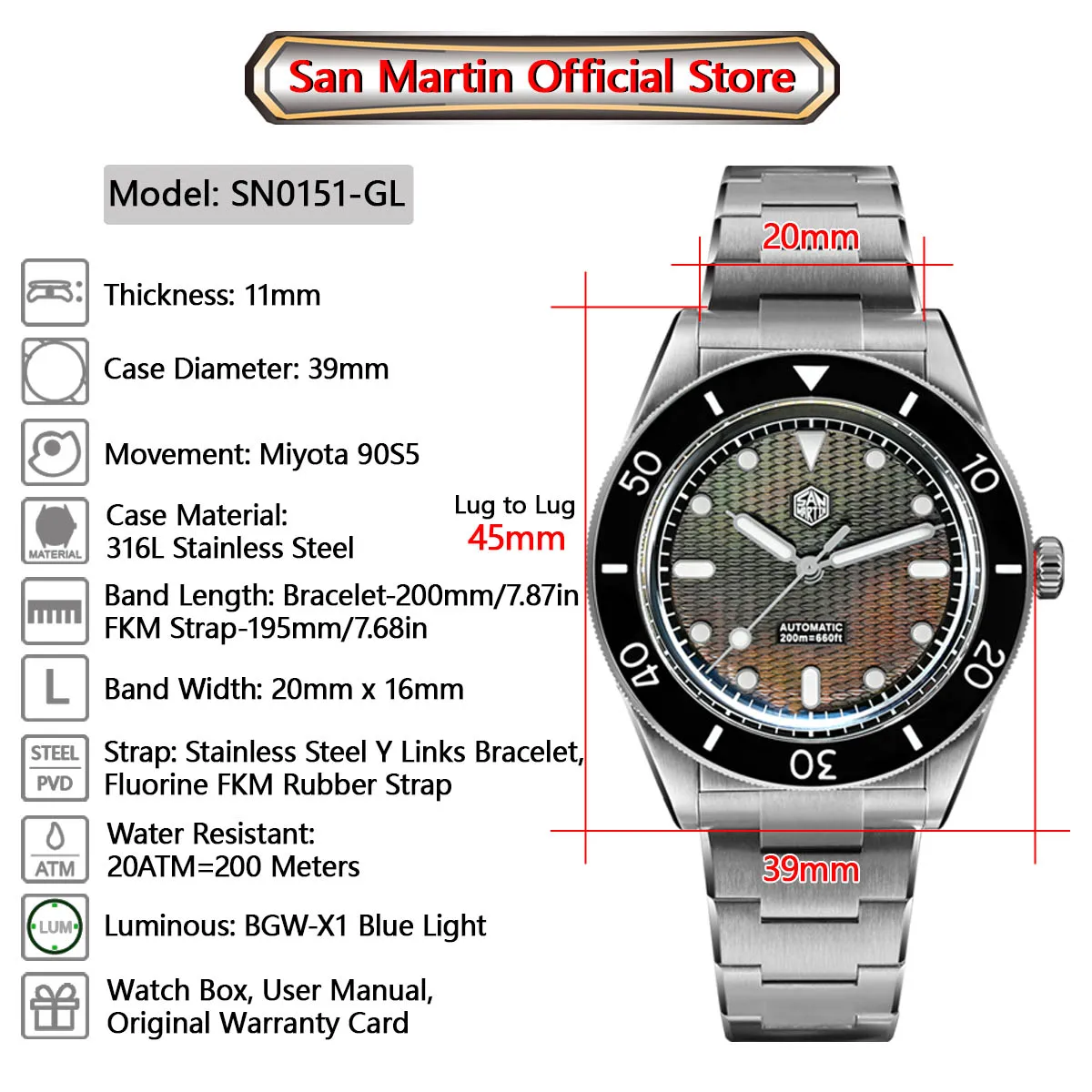 San Martin SN0151 39mm Guilloche MOP Dial Miyota 90S5 Automatic Diver Sapphire Bezel 20 ATM Luminous SN0151