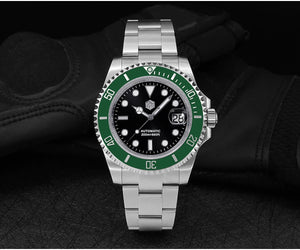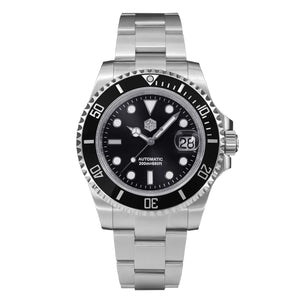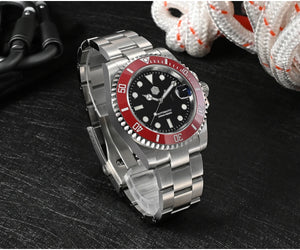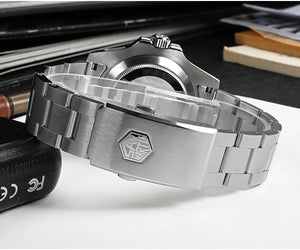 The San Martin SUB Diver SN0019G features a robust 41mm case paired with a PT5000 SW200 automatic movement, ensuring precise timekeeping. Its anti-reflective sapphire crystal enhances clarity, while 20-bar water resistance makes it ideal for professional diving. The BGW-9 luminous markers deliver exceptional visibility underwater or in low light, blending durability and expert craftsmanship in one reliable timepiece.