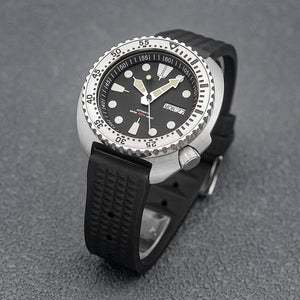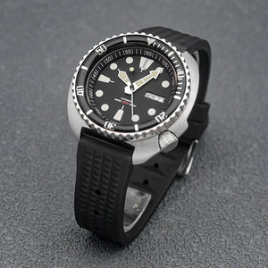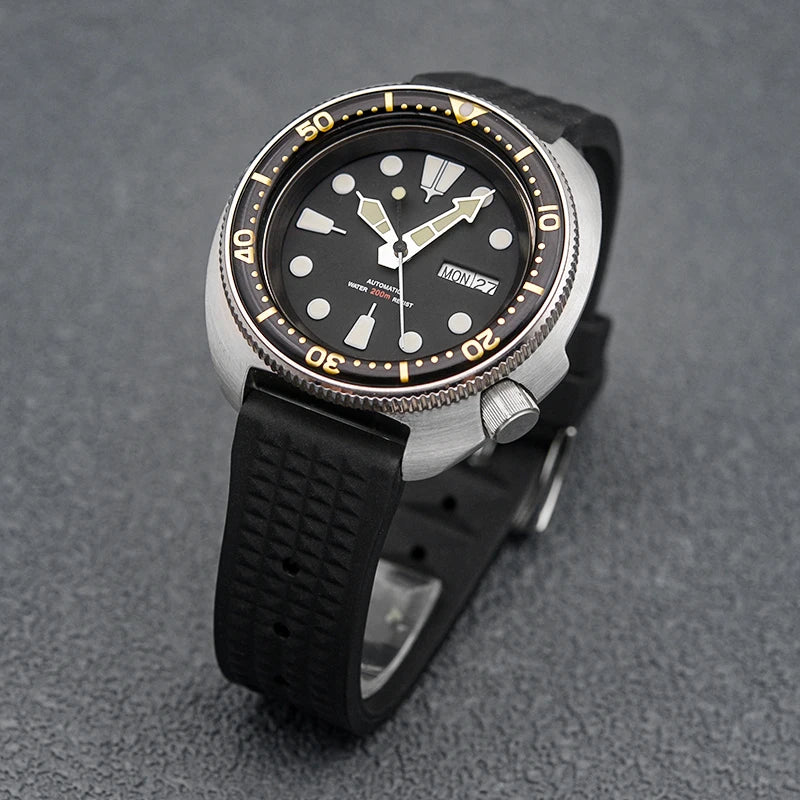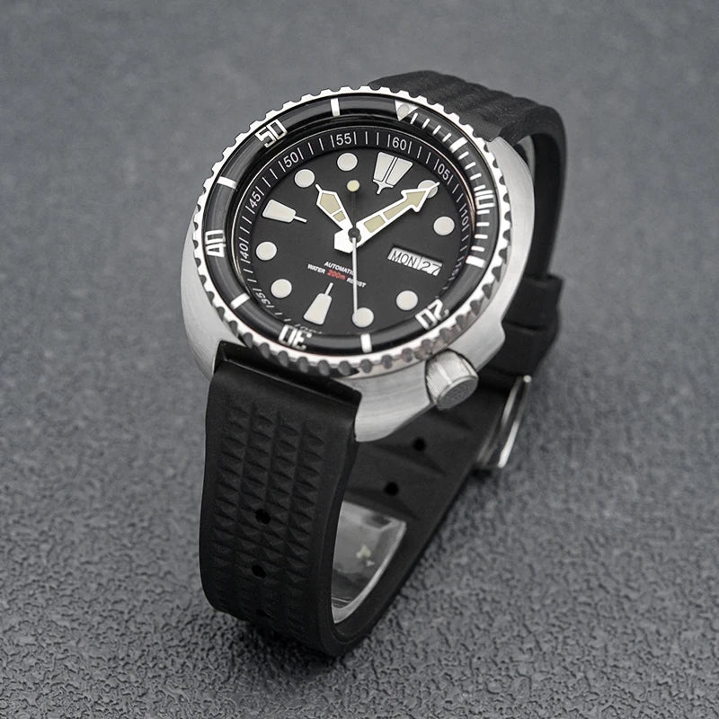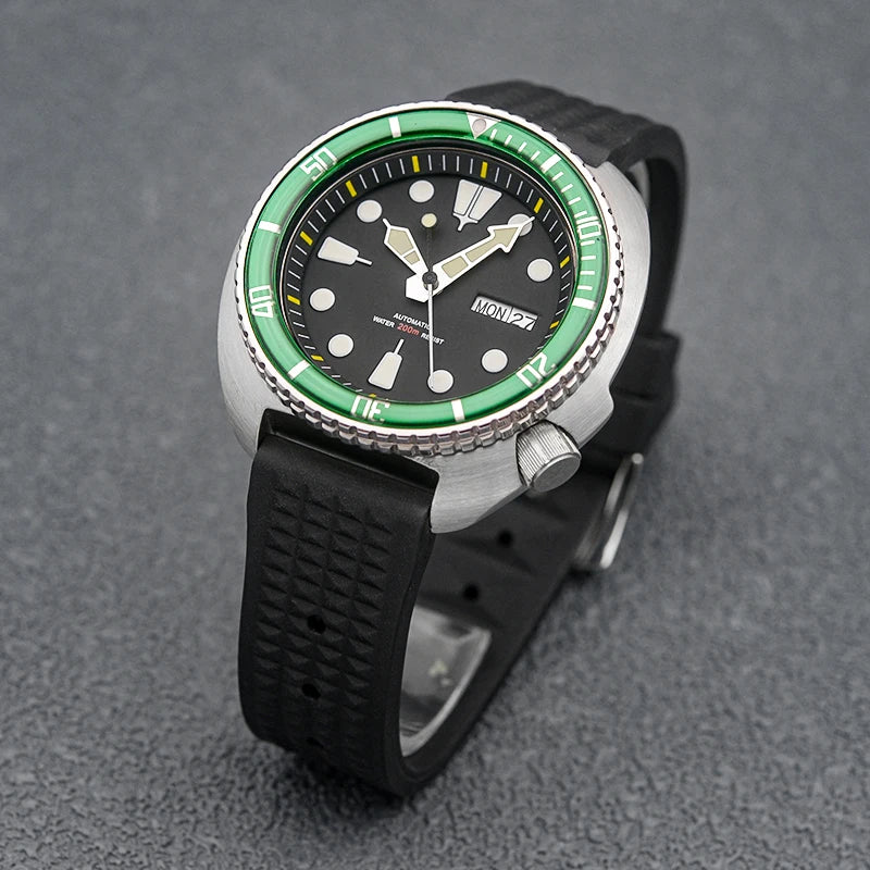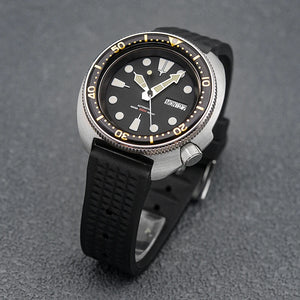 Discover the Dial SKX6105 6309 Sterile Turtle Abalone Stainless Steel 200m Waterproof Watch, designed for men with an NH36A Automatic Movement. This watch features a 44mm diameter case with a thickness of 13.5mm, crafted from 316L stainless steel. The bezel insert measures 38mm*31.6mm (outer diameter * inner diameter), and the case lug-to-lug length is 46mm. The watch is equipped with a screw-in lock crown at 4.1 o'clock and a sealed waterproof back cover. The sapphire crystal glass ensures superior clarity and scratch resistance. With a 20ATM waterproof rating, it's suitable for daily use, handwashing, and swimming. The dial is 28.5mm, fitting NH35, NH36, 4R, and 7S Japan Automatic Movements.