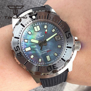 Introducing the Tandorio NH35A 42mm Monster 20Bar Dive Automatic Watch for Men. With its luminous MOP dial and AR sapphire glass, this watch offers not only durability but also visibility in low light conditions. The 3.8 screw crown and rubber band make it perfect for diving. Stay on time and stylish with this automatic watch.