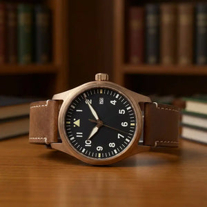 The Tandorio CUSN8 Bronze Pilot Watch delivers a bold tool-watch character with premium materials and reliable mechanics. Built with a solid CUSN8 bronze case, it develops a unique patina over time, making each watch one of a kind. Powered by the dependable Japan NH35 automatic movement and protected by sapphire crystal, it offers excellent legibility, durability, and 20BAR water resistance—ideal for daily wear or aviation-inspired collections.