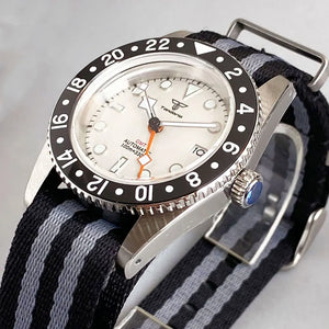 The Tandorio Nh34 GMT Mechanical Wristwatch is a stylish and functional timepiece, designed for both fashion and adventure enthusiasts. Built with a solid 316L stainless steel case, it offers a sleek, durable finish. The domed sapphire crystal dial window ensures scratch resistance, while the luminous display enhances readability in low light. Powered by the precise NH34A automatic self-winding movement, this watch features a date window at 3 o'clock and a unidirectional bezel ring for added functionality. With a robust 20ATM water resistance rating, it's suitable for diving and everyday use. The watch is complemented by a comfortable nylon strap with a pin buckle clasp, and is available in black, white, or blue dial options, making it a versatile accessory for any occasion.