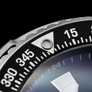 Unidirectional Rotating Bezel: 120-click mechanism with two-tone aluminum insert and luminous bead at 12 o’clock.