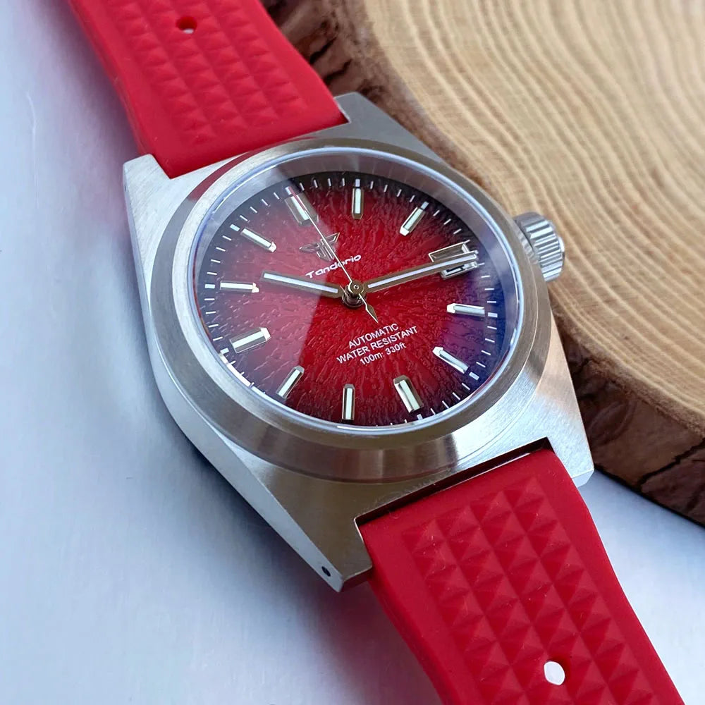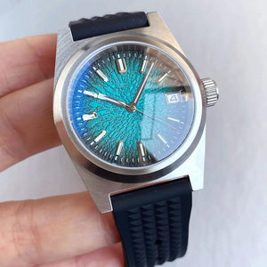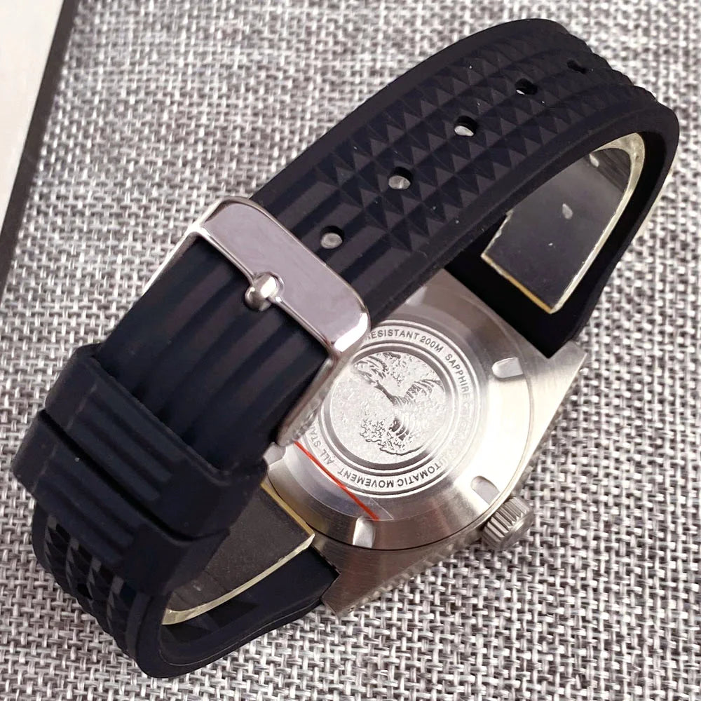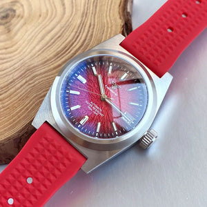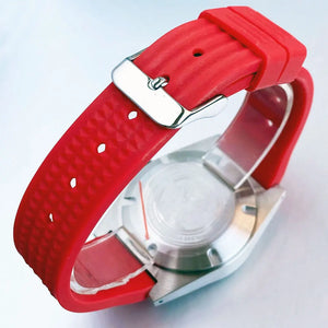 The Unimatic U2 Tandorio combines Swiss-inspired design with robust functionality in a compact 38mm case. Featuring an AR-coated sapphire crystal for enhanced clarity and scratch resistance, this dive watch delivers 200m water resistance suitable for recreational diving and water sports. The striking black, blue, and red dial offers excellent legibility, while the reliable NH35 automatic movement ensures consistent timekeeping. A durable waffle strap provides comfort and grip, and the exhibition caseback reveals the mechanical heart of this timepiece. Built for enthusiasts who demand both aesthetic appeal and practical performance.